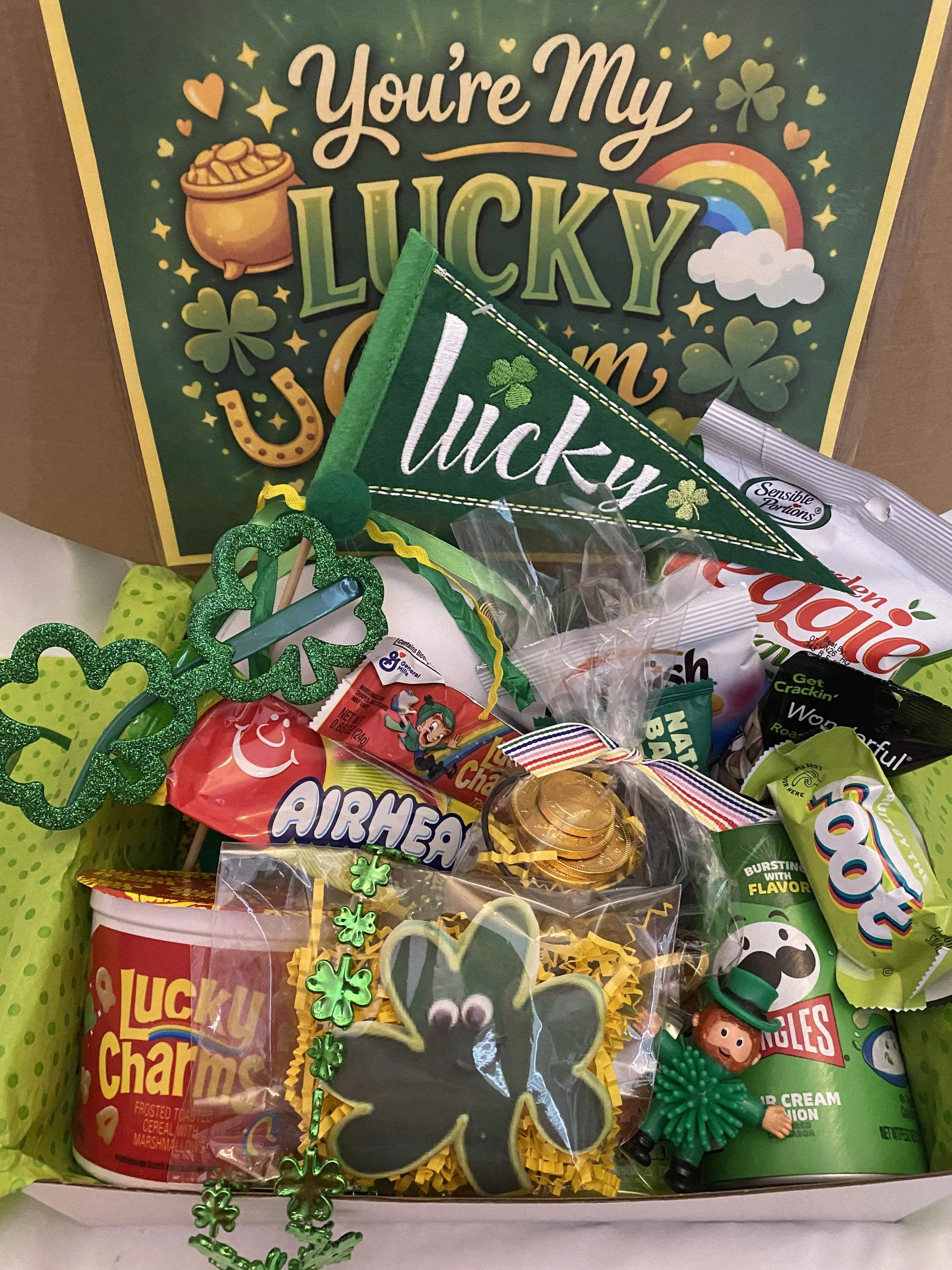 Send a little luck their way with this St. Patrick’s Day–themed care package! Packed with festive fun like a “Lucky” trucker hat, shamrock glasses for instant party vibes, a “pot of gold” filled with chocolate coins, a large, iced shamrock cookie, and a lucky leprechaun, this box is pure March magic.